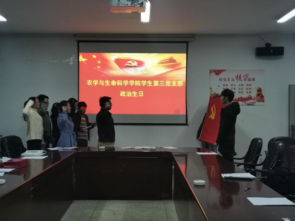 农学与生命科学学院学生第三党支部于2019年12月13日在农学楼1601会议室召开预备党员转正大会暨2019年度组织生活会会前集体学习,并为11、12月份加入党组织的党员举行政治生日仪式。