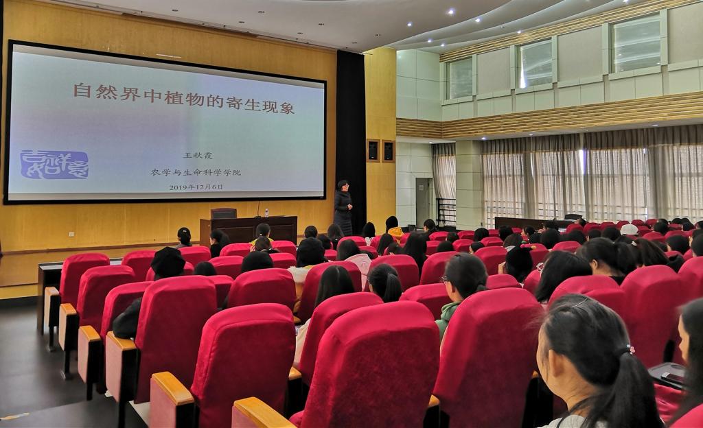 2019年12月6日下午,我院博士王秋霞老师在惟行楼1501报告厅为2019级,2018级,2017级200余名学生做了“自然界中植物的寄生现象”专题讲座。