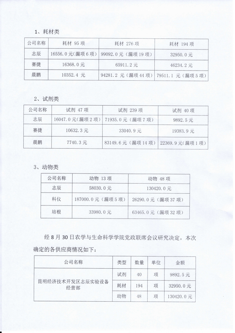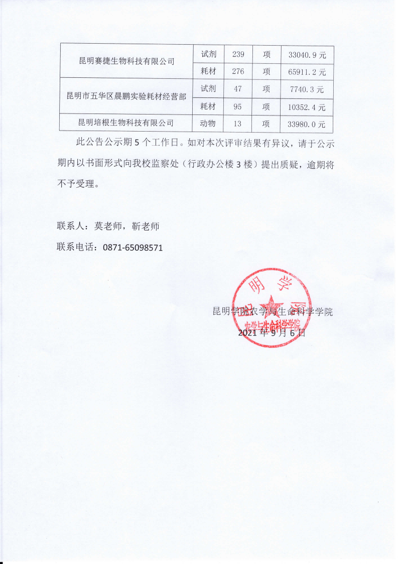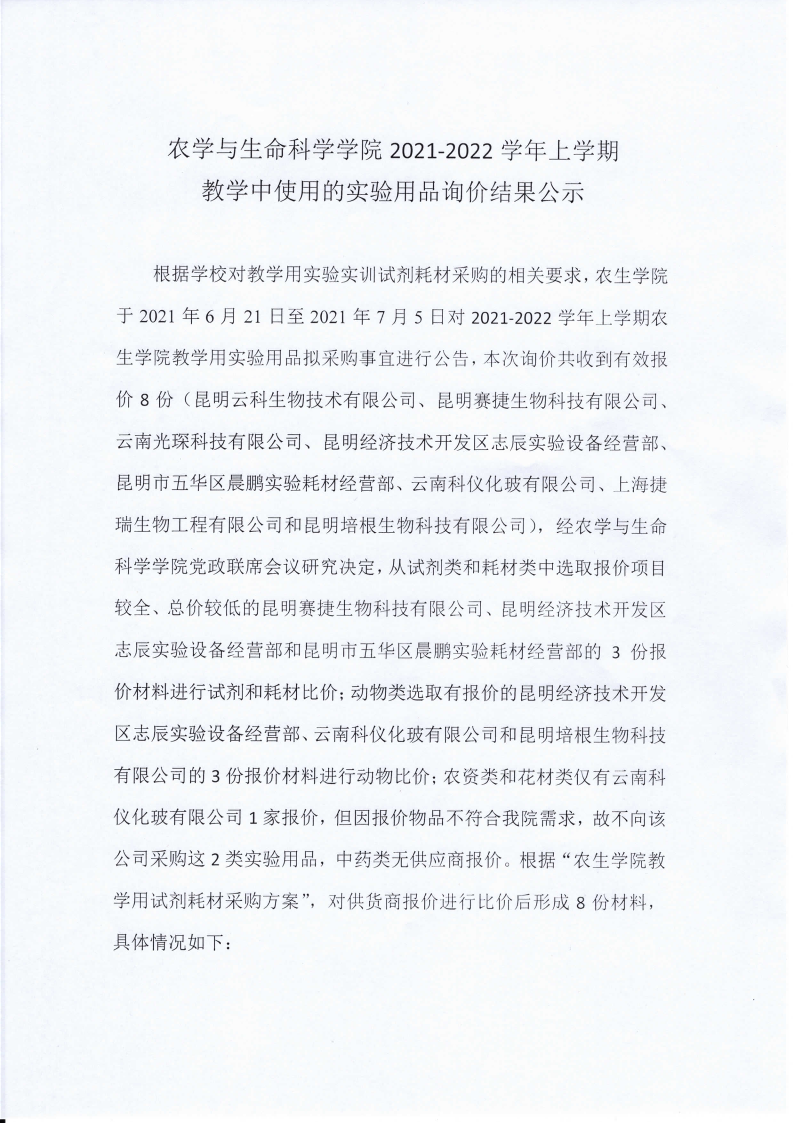 农学与生命科学学院2021-2022学年上学期教学中使用的实验用品询价结果公示