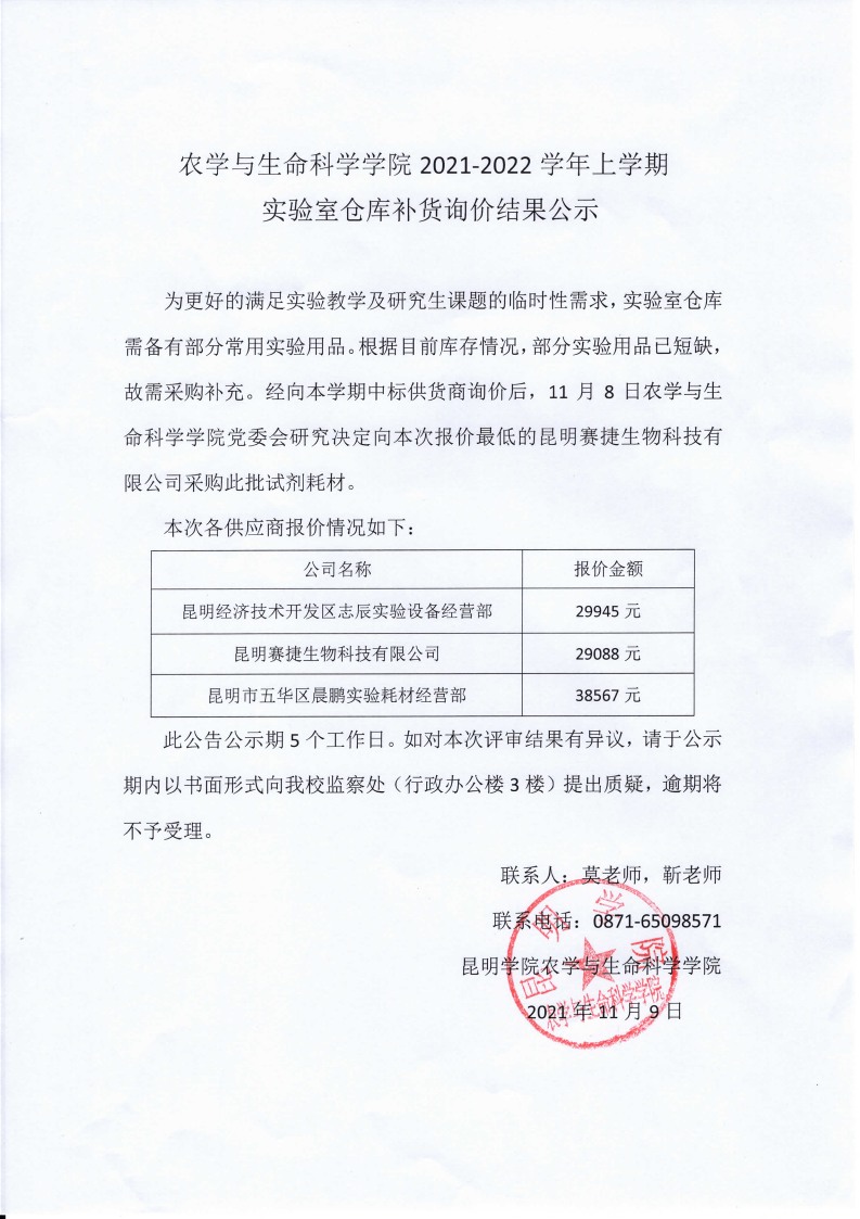 农学与生命科学学院2021-2022学年上学期实验室仓库补货询价结果公示